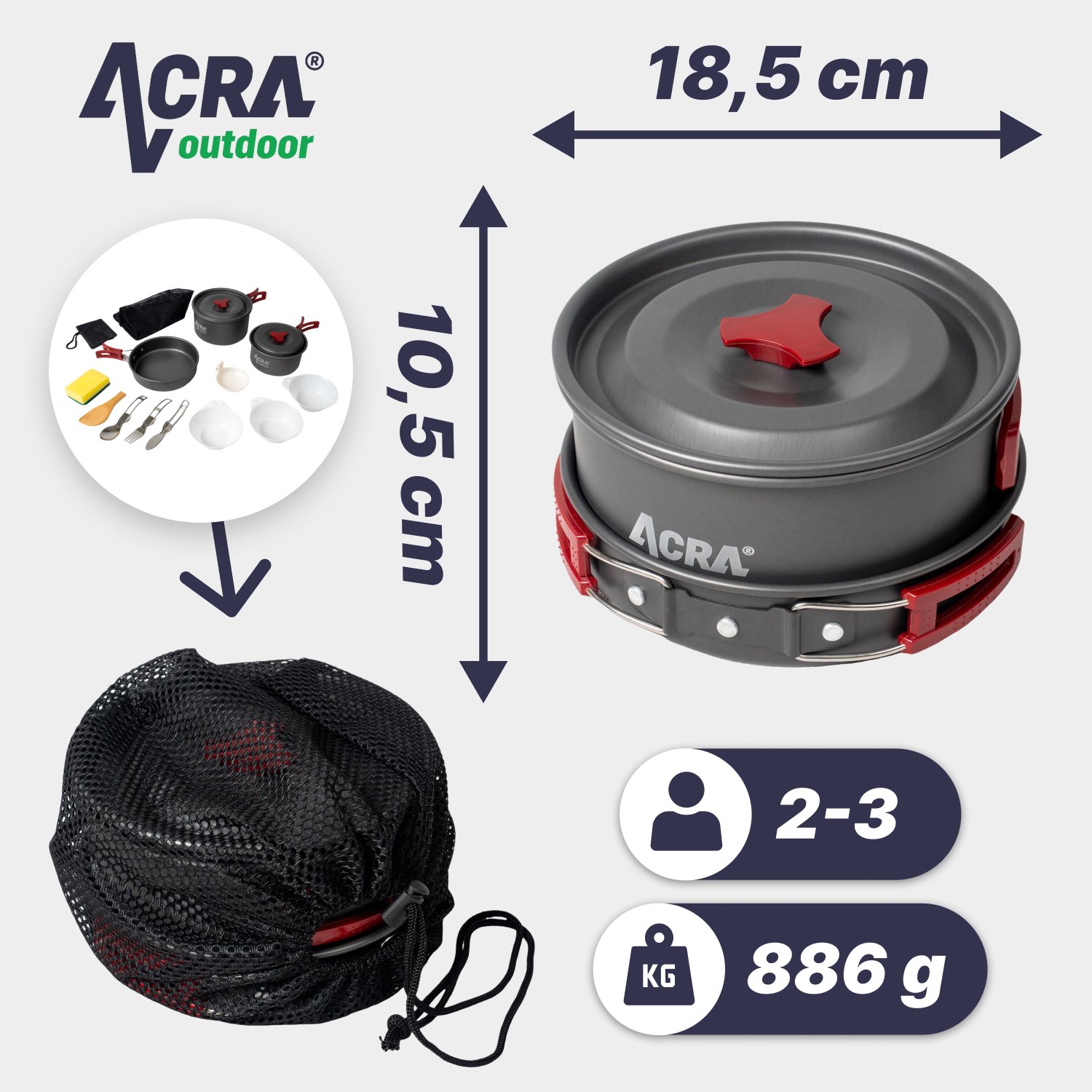 Ultralehká sada nádobí Acra C21 je ideální pro všechny, kteří si cení praktičnosti, nízké hmotnosti a odolnosti. Je perfektní pro turistiku, kempování, piknik i další outdoorové aktivity s přáteli.
