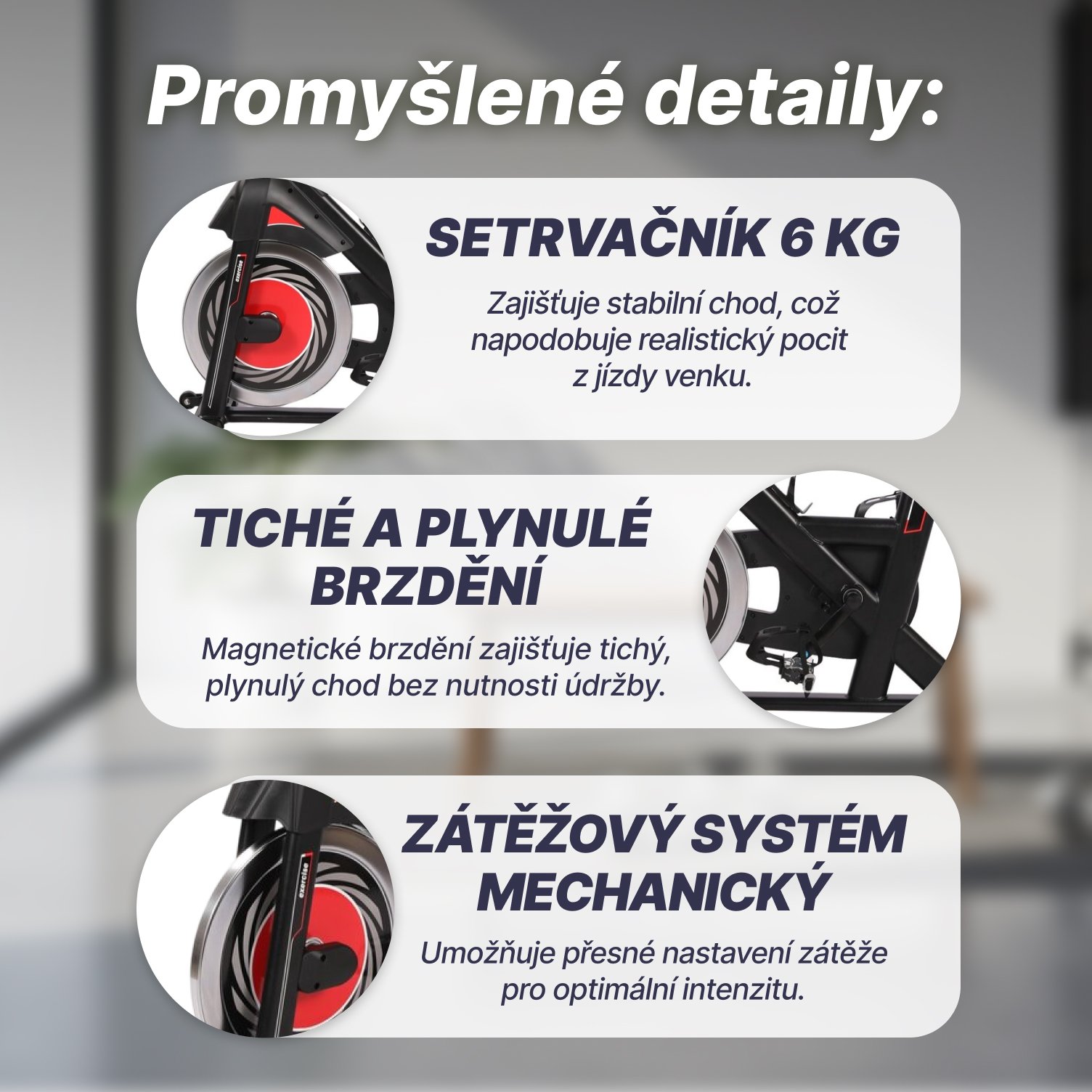 - Setrvačník 6kg: Lehčí setrvačník se snáze roztočí a zpomalí, čímž zajišťuje plynulý chod a realistický pocit z jízdy, jako byste jeli venku na kole. To je ideální pro začátečníky a jezdce, kteří preferují komfortní a tichý trénink.