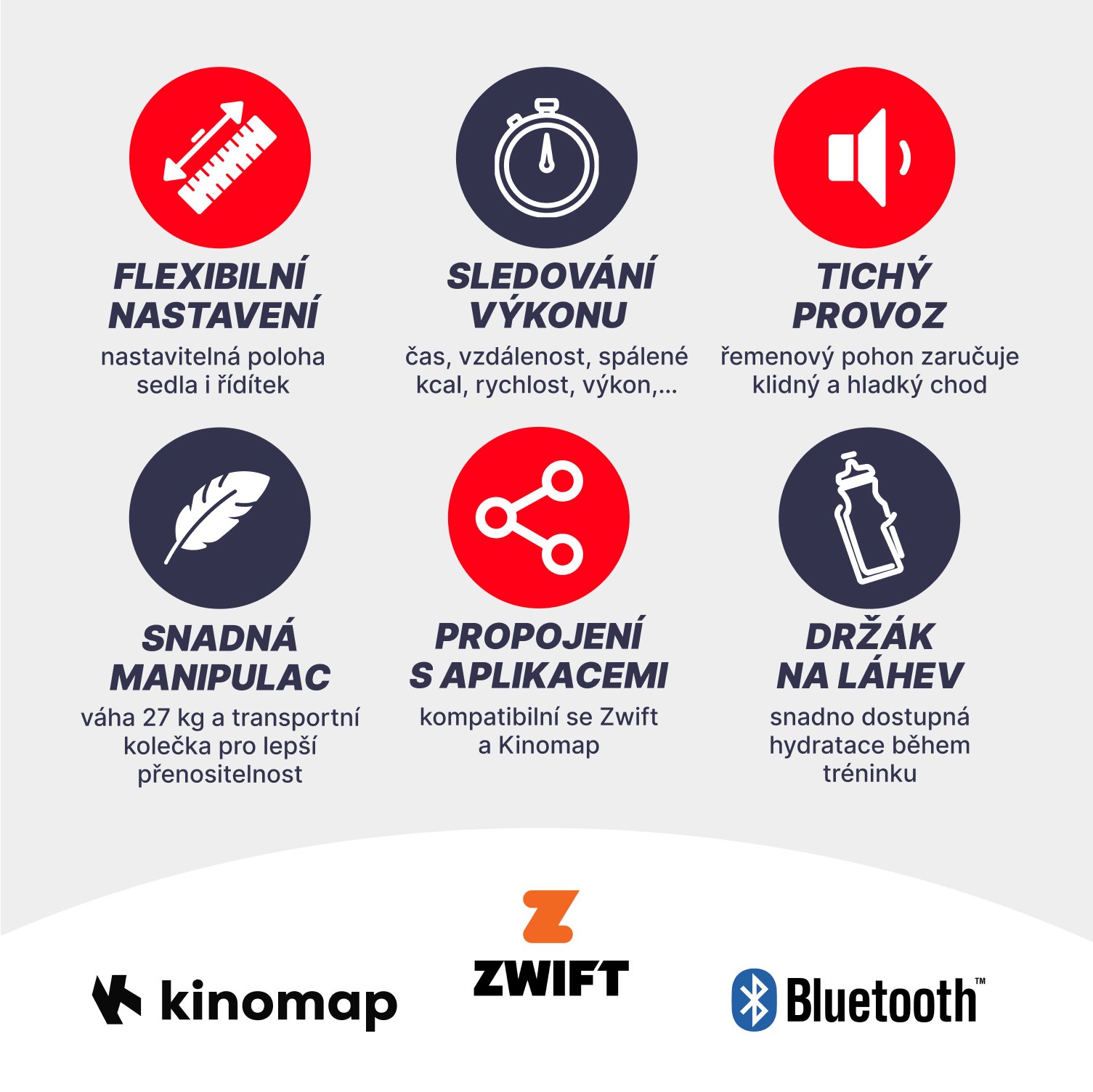 - Kompatibilní s aplikacemi: Možnost připojení přes Bluetooth na oblíbené aplikace, jako je Zwift a Kinomap, pro zábavnější a interaktivnější trénink.