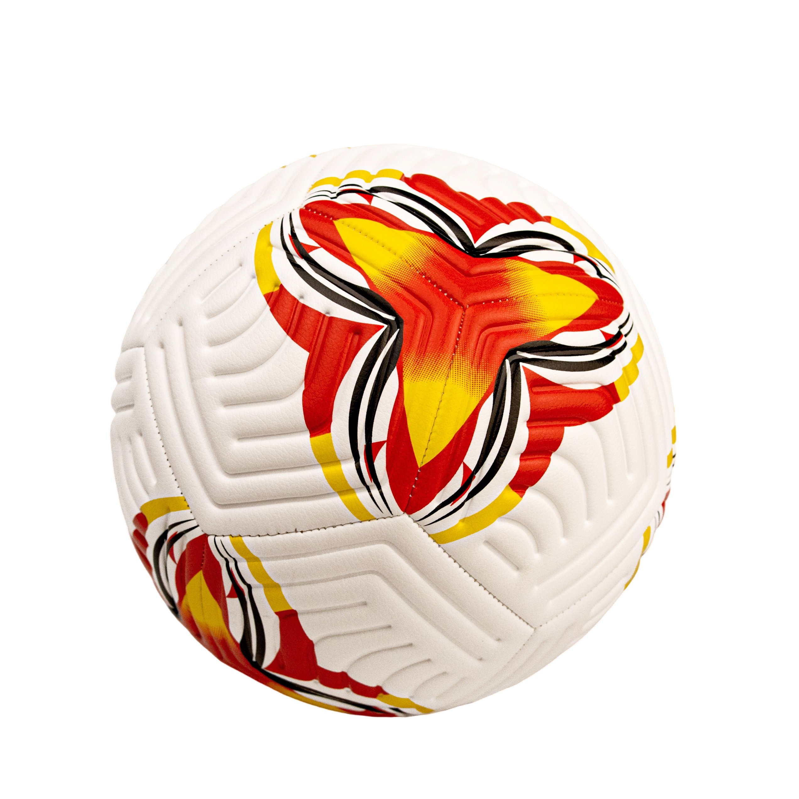 Dynamický Design: Míč se vyznačuje atraktivním bílým základem s výraznými grafickými prvky v kombinaci červené a žluté barvy. Tento moderní design zaručuje, že míč bude na hřišti dobře viditelný.