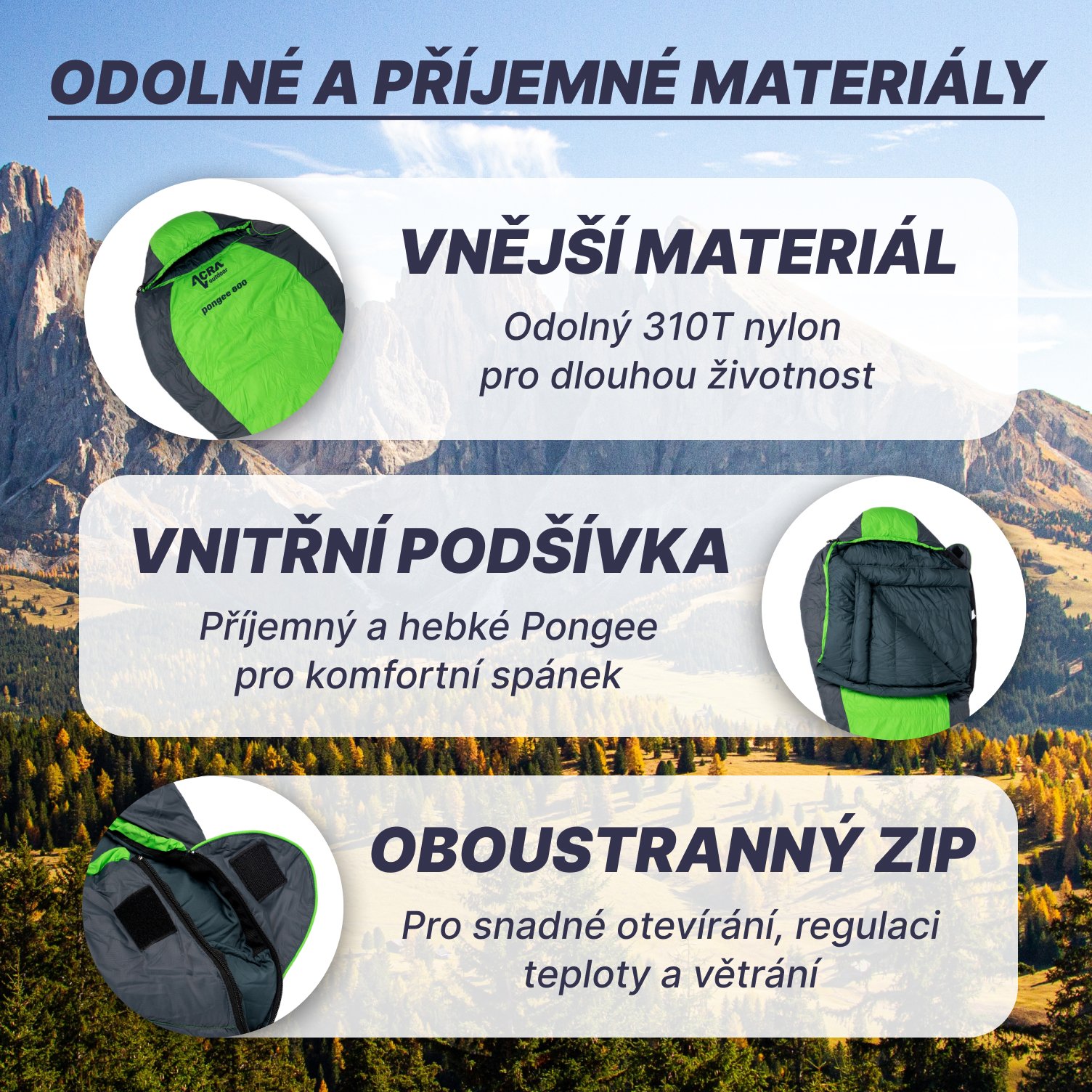 - Oboustranný zip: Spacák se snadno otevírá a zavírá pomocí oboustranného zipu.