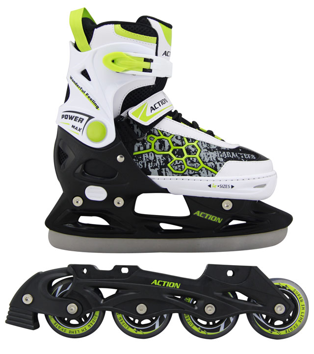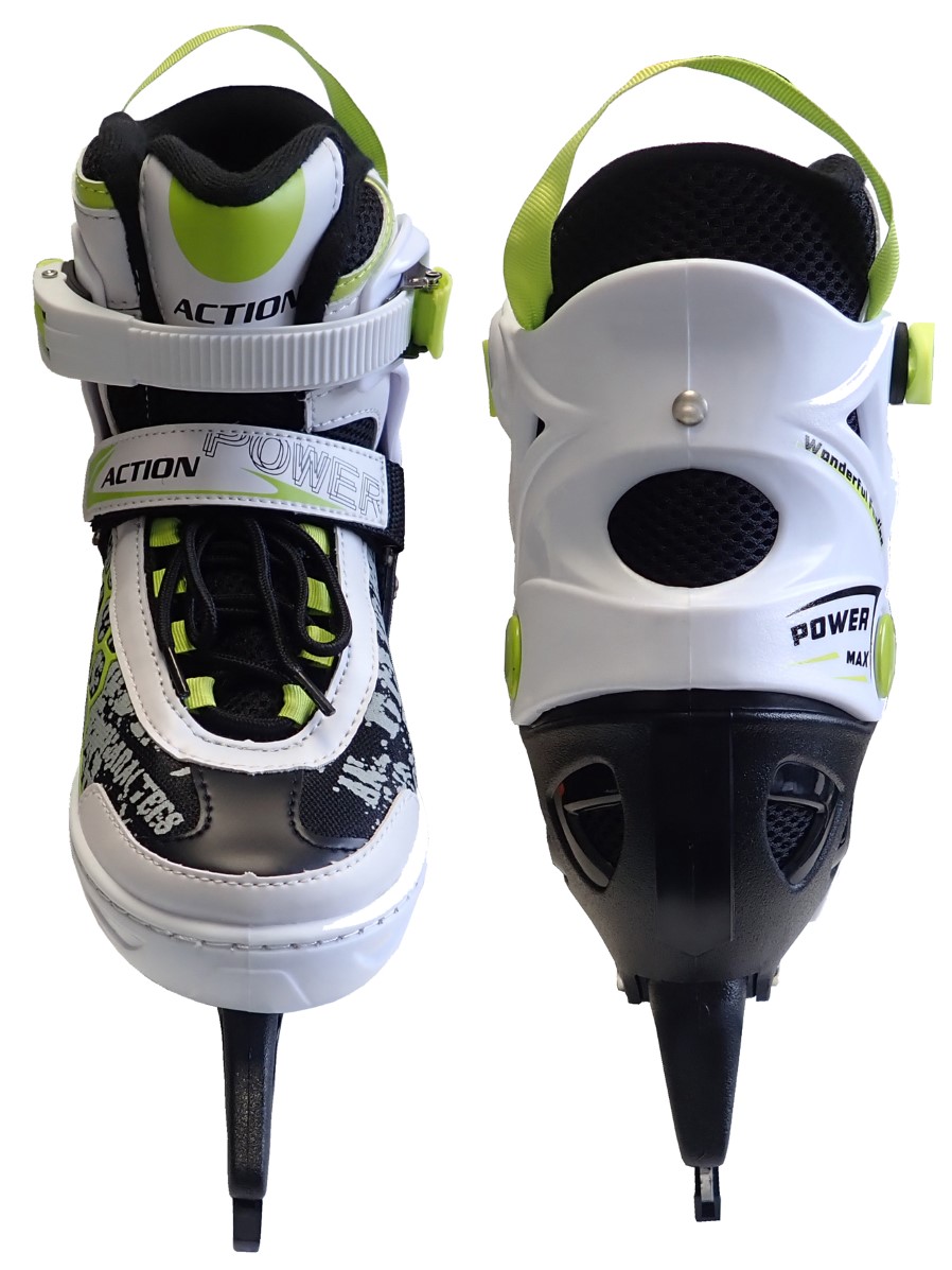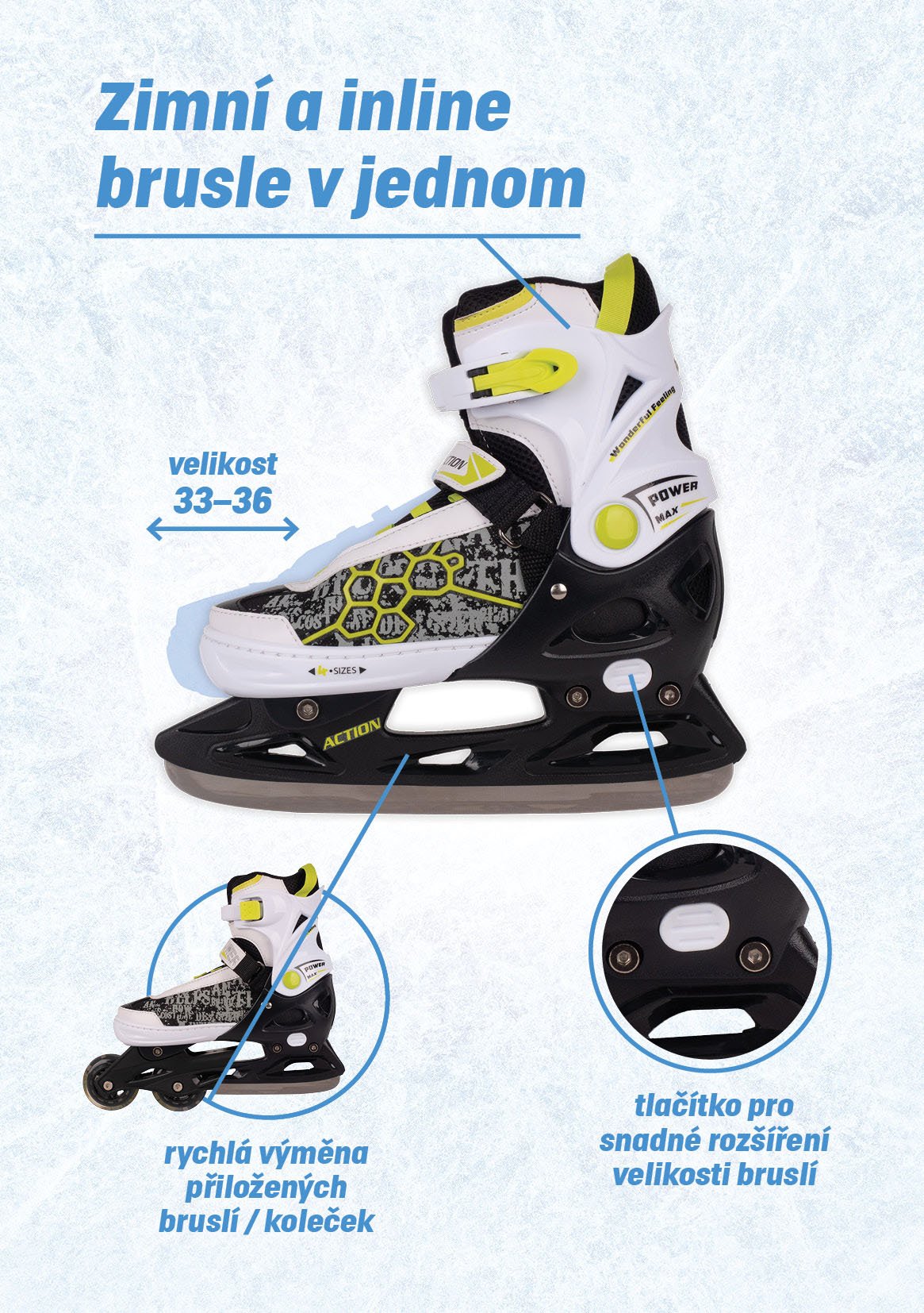 Chlapecké brusle s vyměnitelným podvozkem 2 v 1 představují univerzální řadu bruslí k celoročnímu použití. Přiložené dva podvozky umožňují univerzálně měnit kolečkové brusle se zimními pruslemi - měkká šněrovací bota s přezkou a stahovacím páskem na suchý zip, vnitřní výplň s "pamětí", ložiska ABEC - 5, zpevněný plastový podvozek, PU vrstvená kolečka 70 x 24 mm v transparentní barvě, vel. 33 - 36 = 20,5 - 22,5 cm. Zimní nůž na bruslení má plastový základ z ABS plastu s kovovým břitem ze zušlechtěné oceli. Kvalitní podvozek, ložiska a kolečka, případně zimní nůž umožňují komfortní celoroční bruslení. Nosnost bruslí je 80 kg. Výměna je velmi jednoduchá pomocí povolení a vyjmutí nože z držáku a následného utažení těchto šroubů po vložení druhého držáku.Dodavatel: ACRA s.r.o., Brodská 161, Semily, 51301, obchod@acra.cz, 420481389087