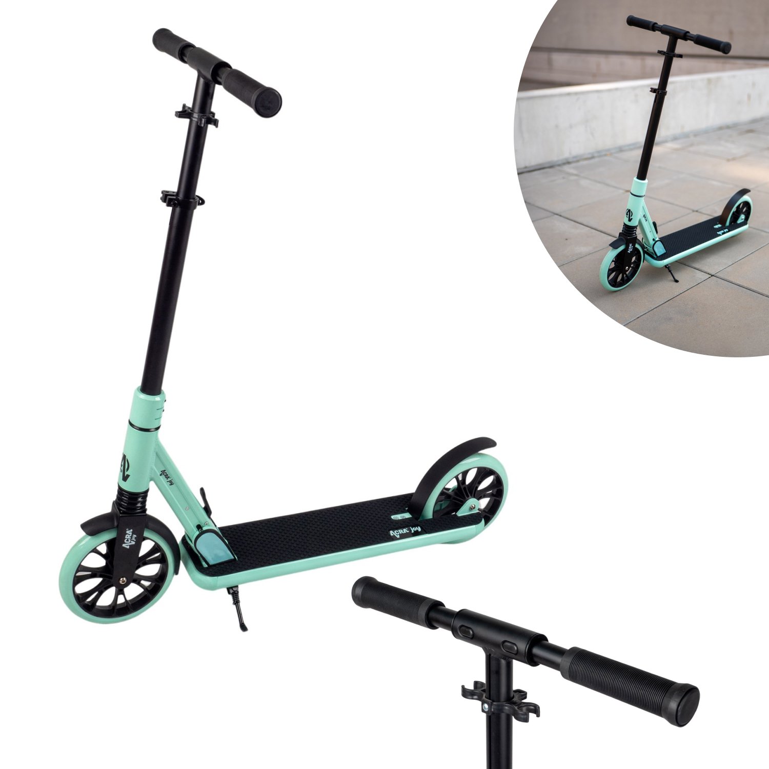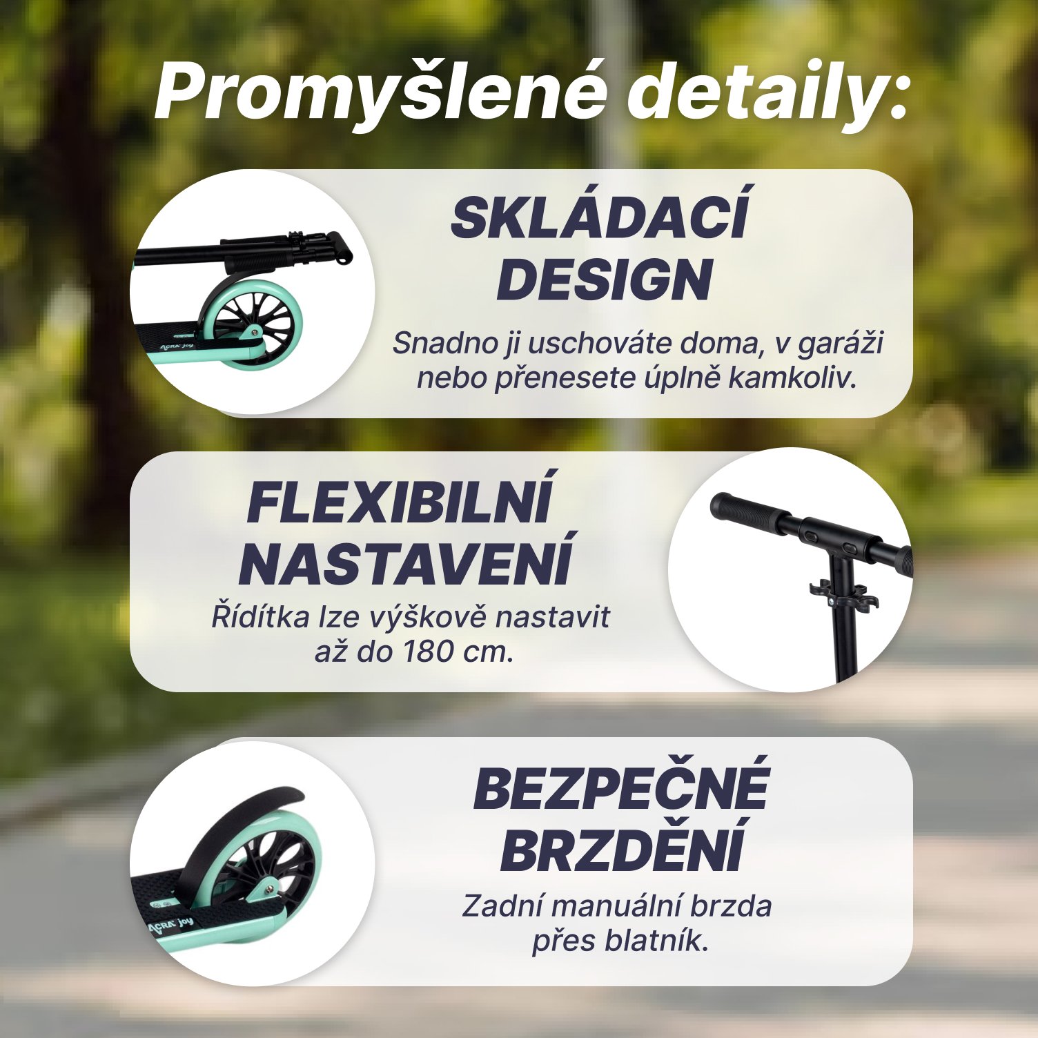 - Řídítka koloběžky jsou nastavitelná až do výšky 180 cm a mají gumové skládací rukojeti.