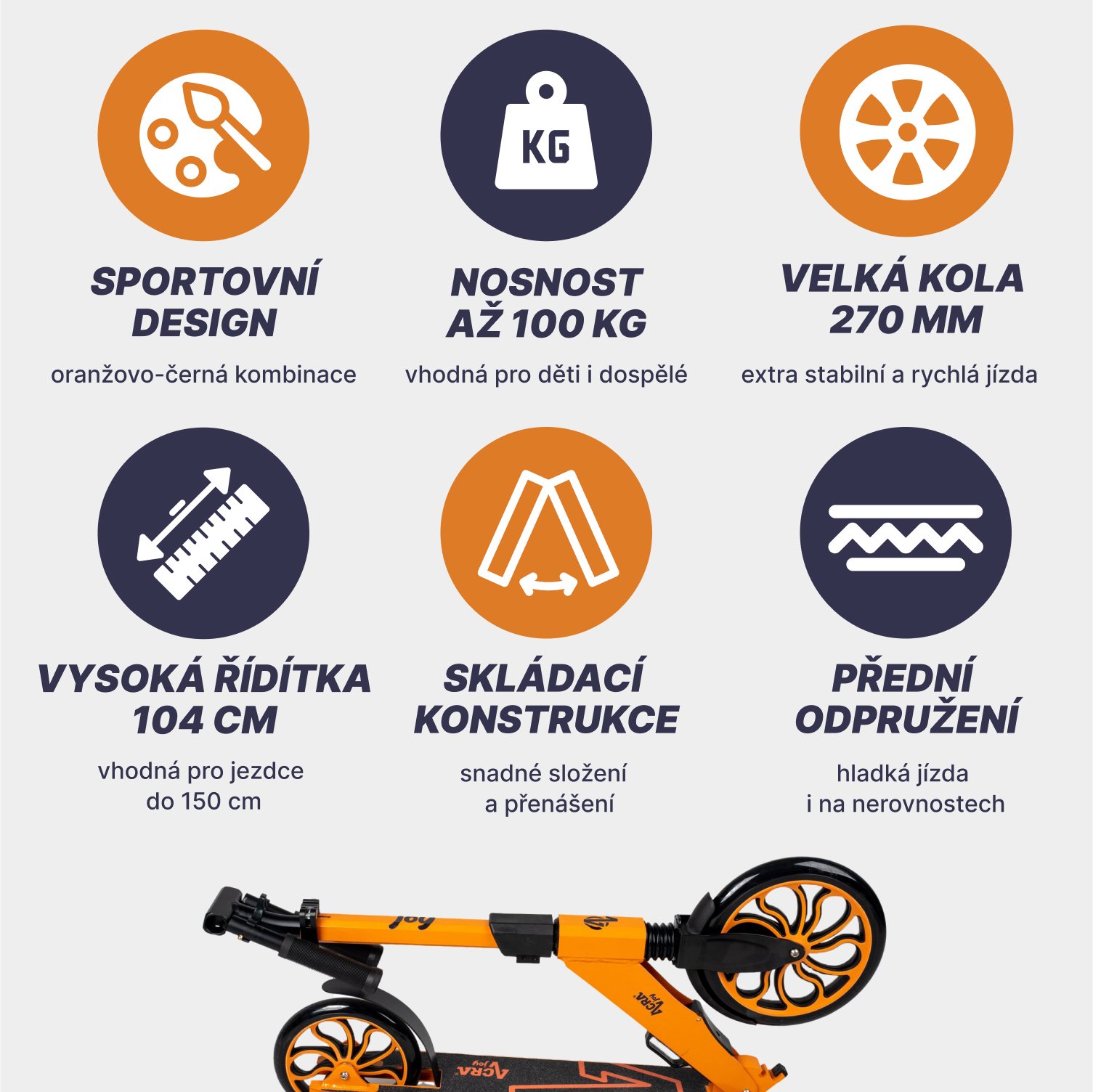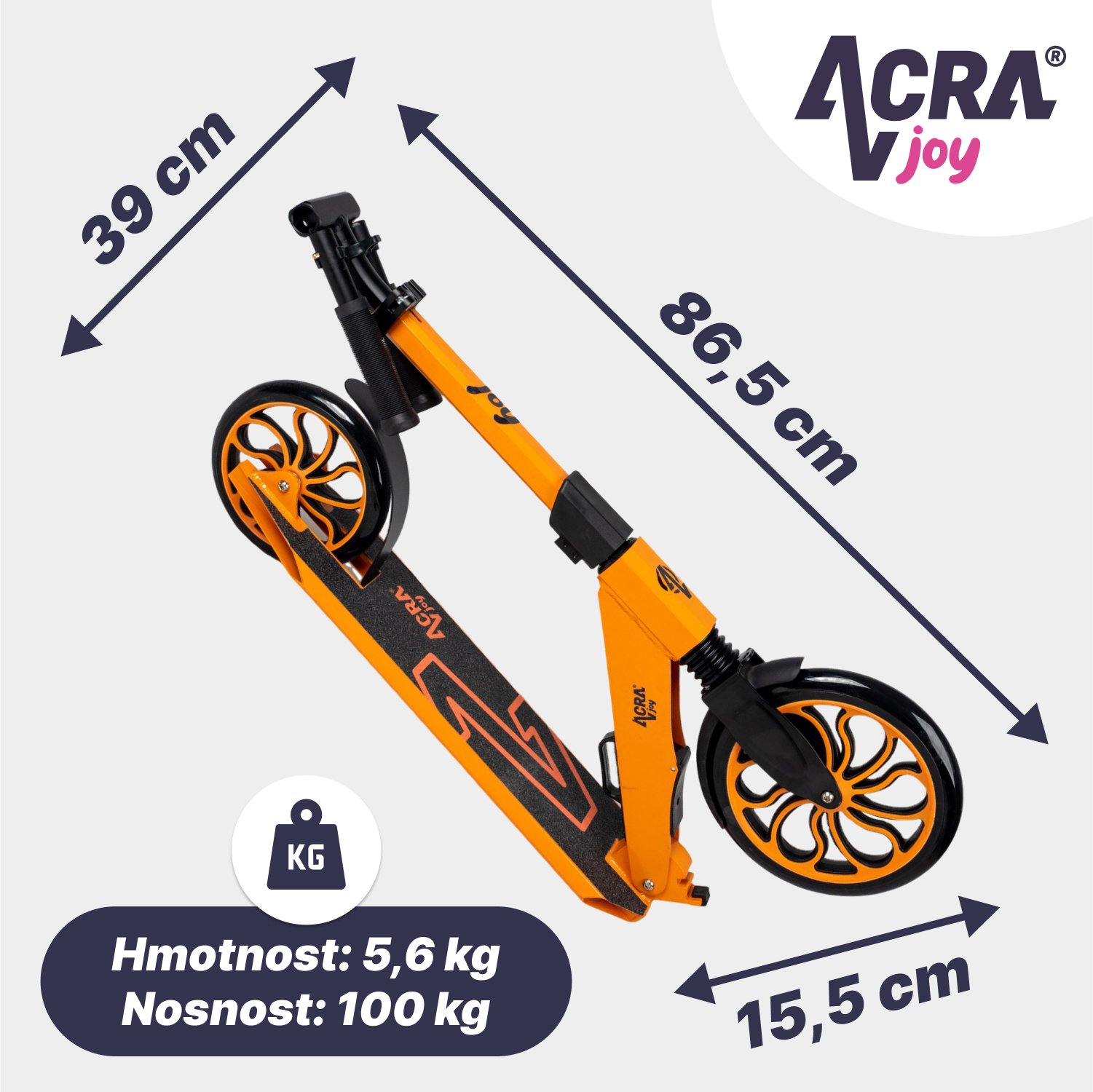 Koloběžka Acra Joy Stinger je rychlá, sportovní, ideální pro jízdu po silnici i v menším terénu. Je vhodná pro jezdce všech úrovní a je ideální nejen pro dojíždění do práce nebo školy, ale i pro zábavu a volný čas i pro výlety do terénu. Se Stingrem poletíte díky velkým kolům 270mm.