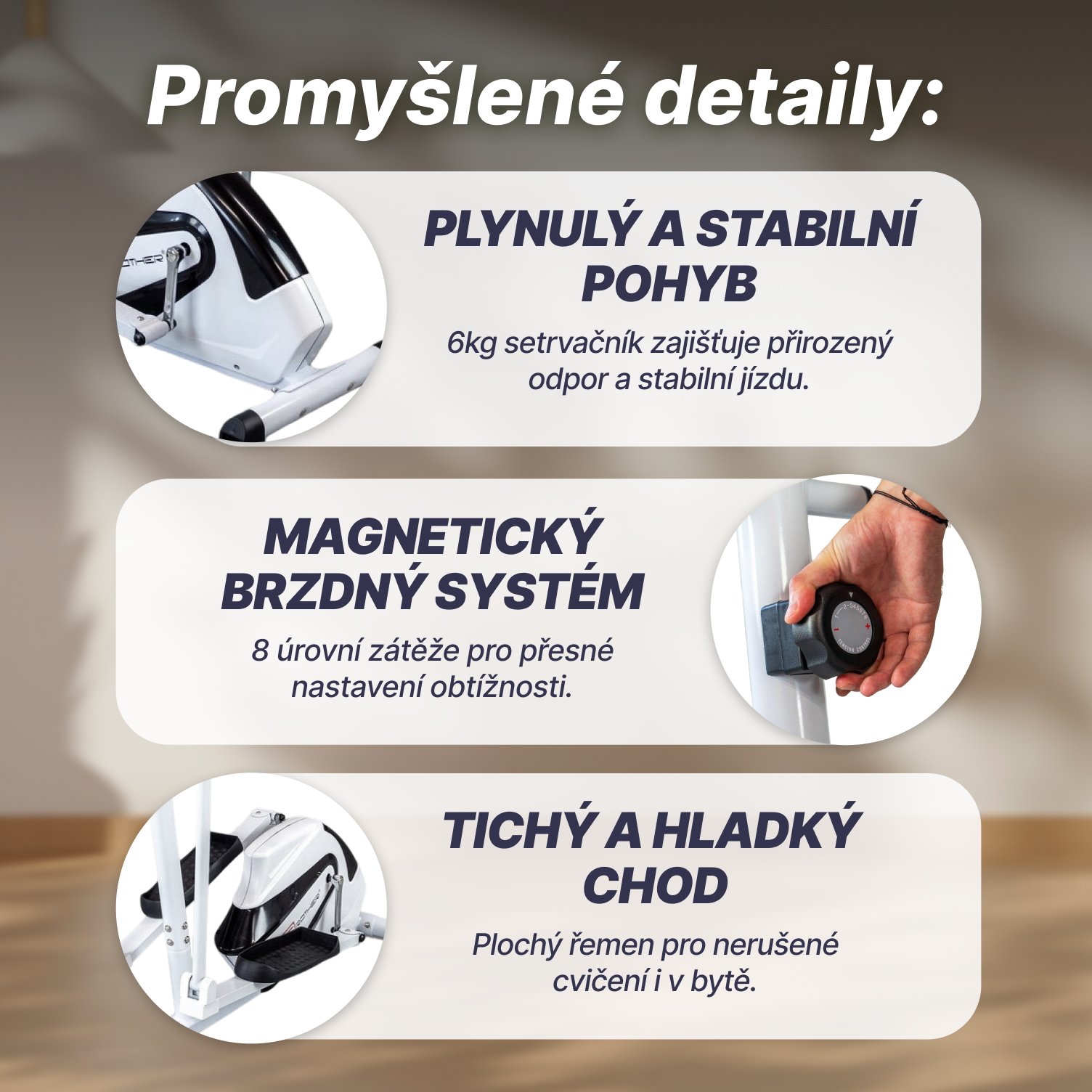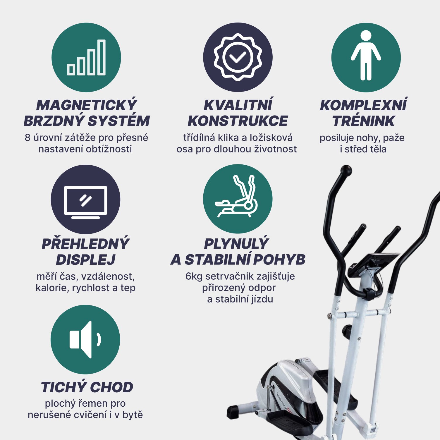 - váha setrvačníkového kola 6 kg s účinným magnetickým systémem nastavování zátěže. Tento systém je tichý a účinný s možností nastavení 8 různých stupňů odporu magnetů.