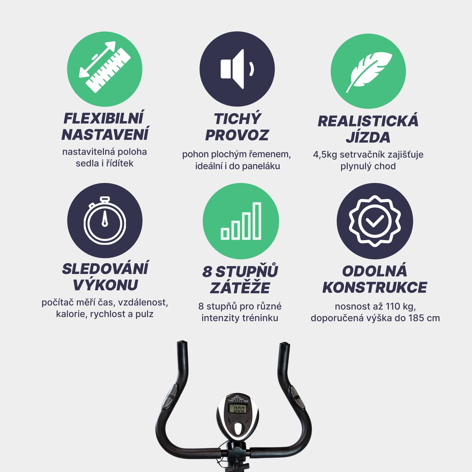- Funkce computeru: SCAN, ČAS, VZDÁLENOST, KALORIE, MĚŘENÍ PULSU, RYCHLOST.