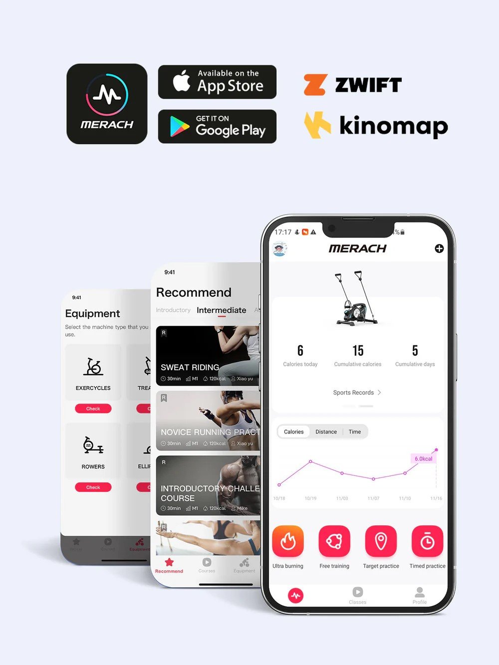 - Inteligentní sledování a tréninky s průvodcem – Disponuje LCD displejem a bezplatnou aplikací MERACH pro sledování údajů v reálném čase a časované tréninky.