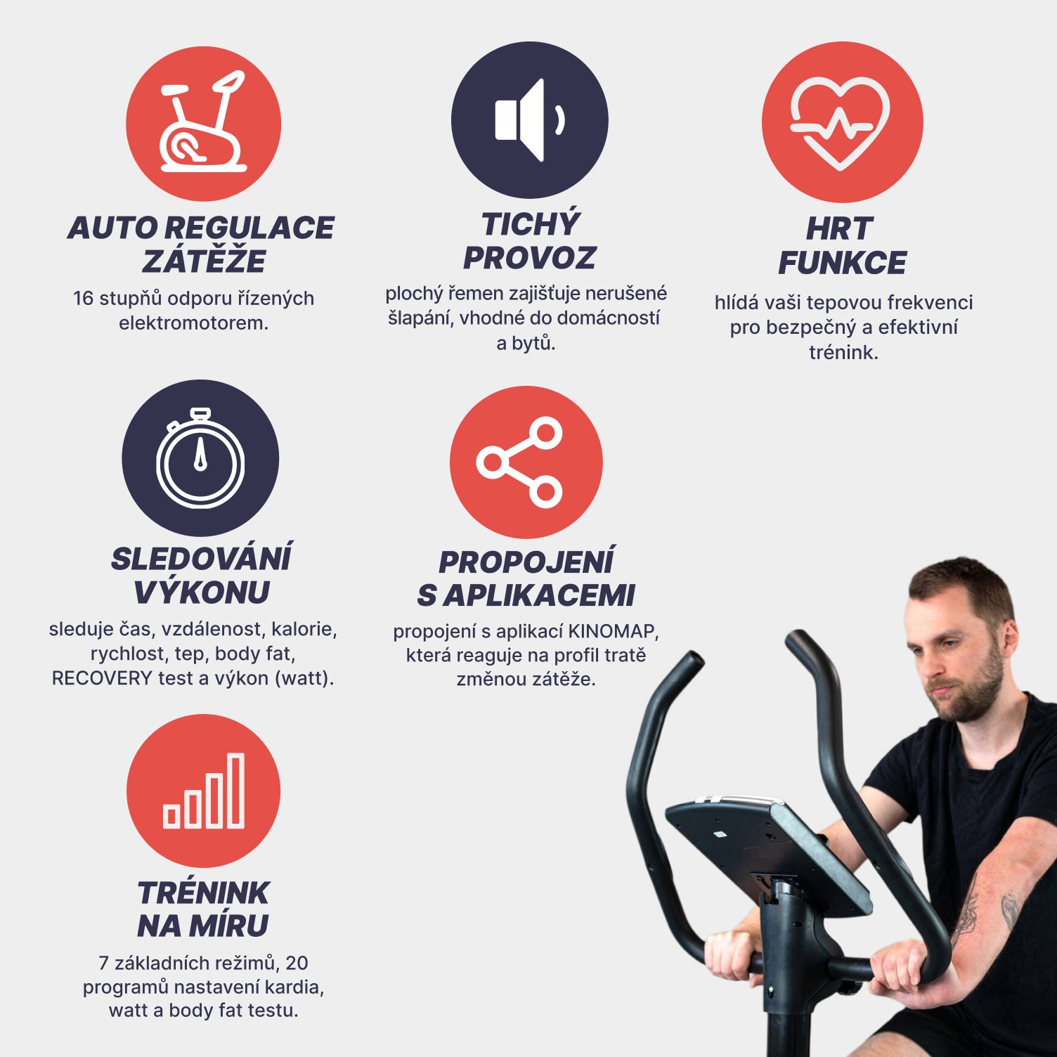 - Možnost použití aplikací napojených přes tablet nebo mobilní telefon. Doporučujeme použití aplikací KINOMAP, které nabízejí širokou škálu použití s možností placených rozšířených funkcí podle vlastního přání.