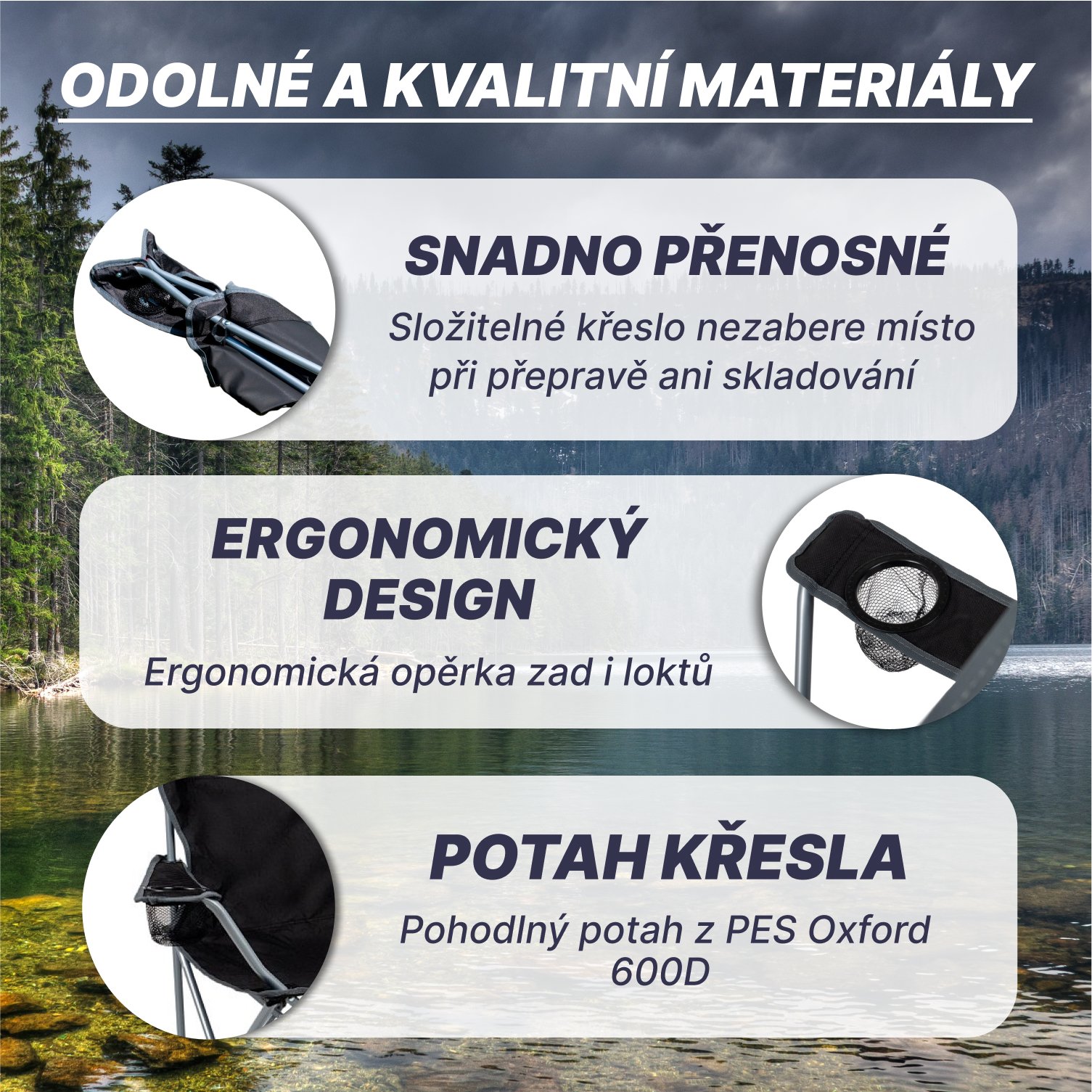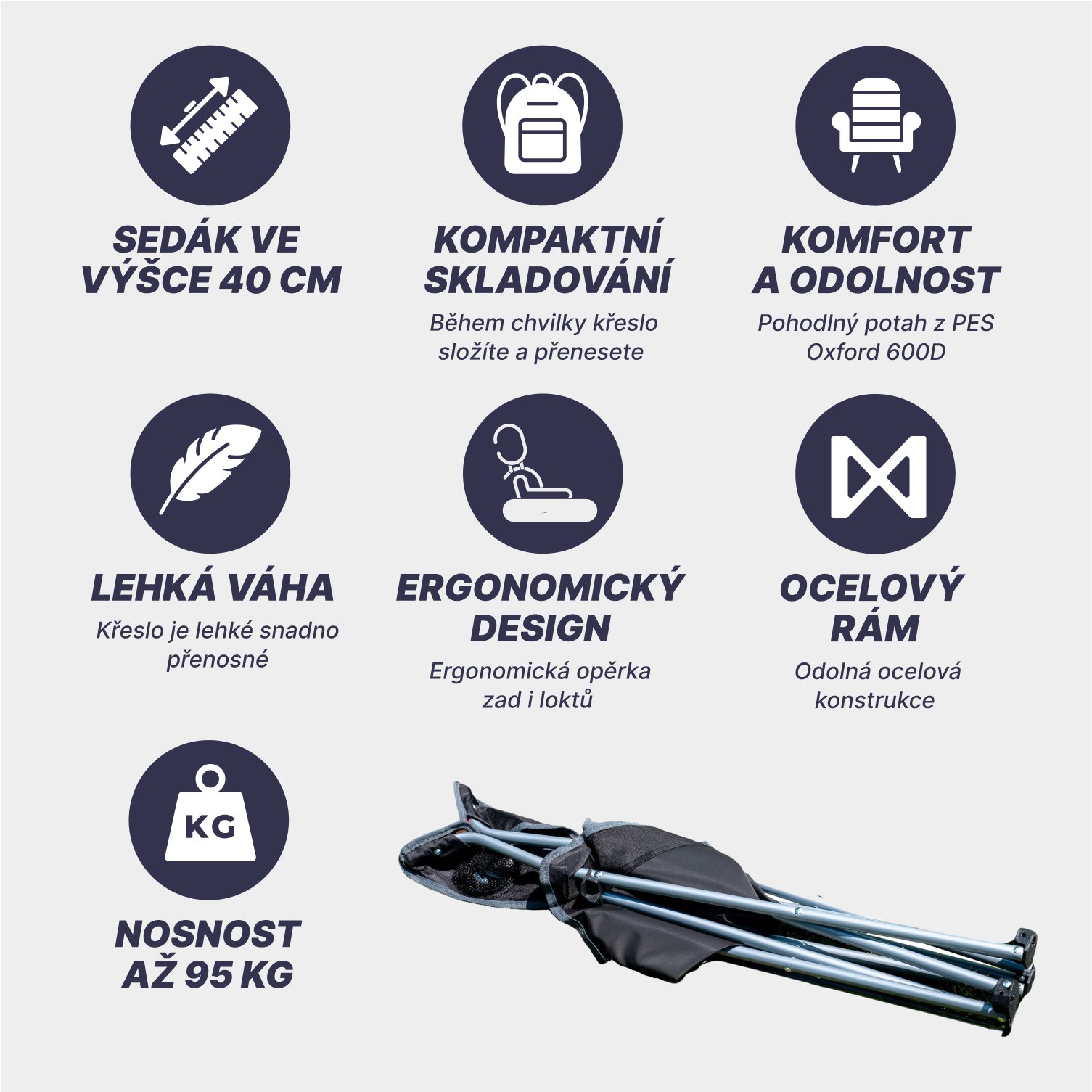 Skládací křeslo - univerzální. Konstrukce - ocelové trubky o průměru 16mm. Sedák opěrka a područky - PES Oxford 600 D. Rozměry v rozloženém stavu jsou 50x50x80cm. Sedák je ve výšce 40 cm od země.…