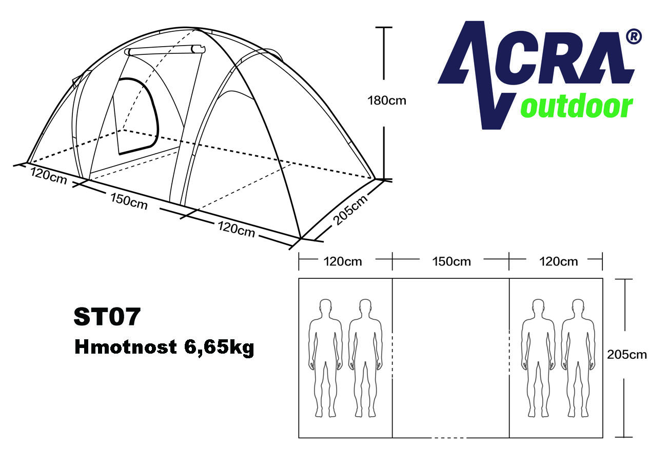 Stan rodinný- rozměry: (120+140+120 cm - šířka stanu - obě ložnice + předsíňka) x 205 cm (hloubka stanu) x 180/135 cm (výška stanu v předsíňce, nižší výška je pro prostor nad ložnicemi)
